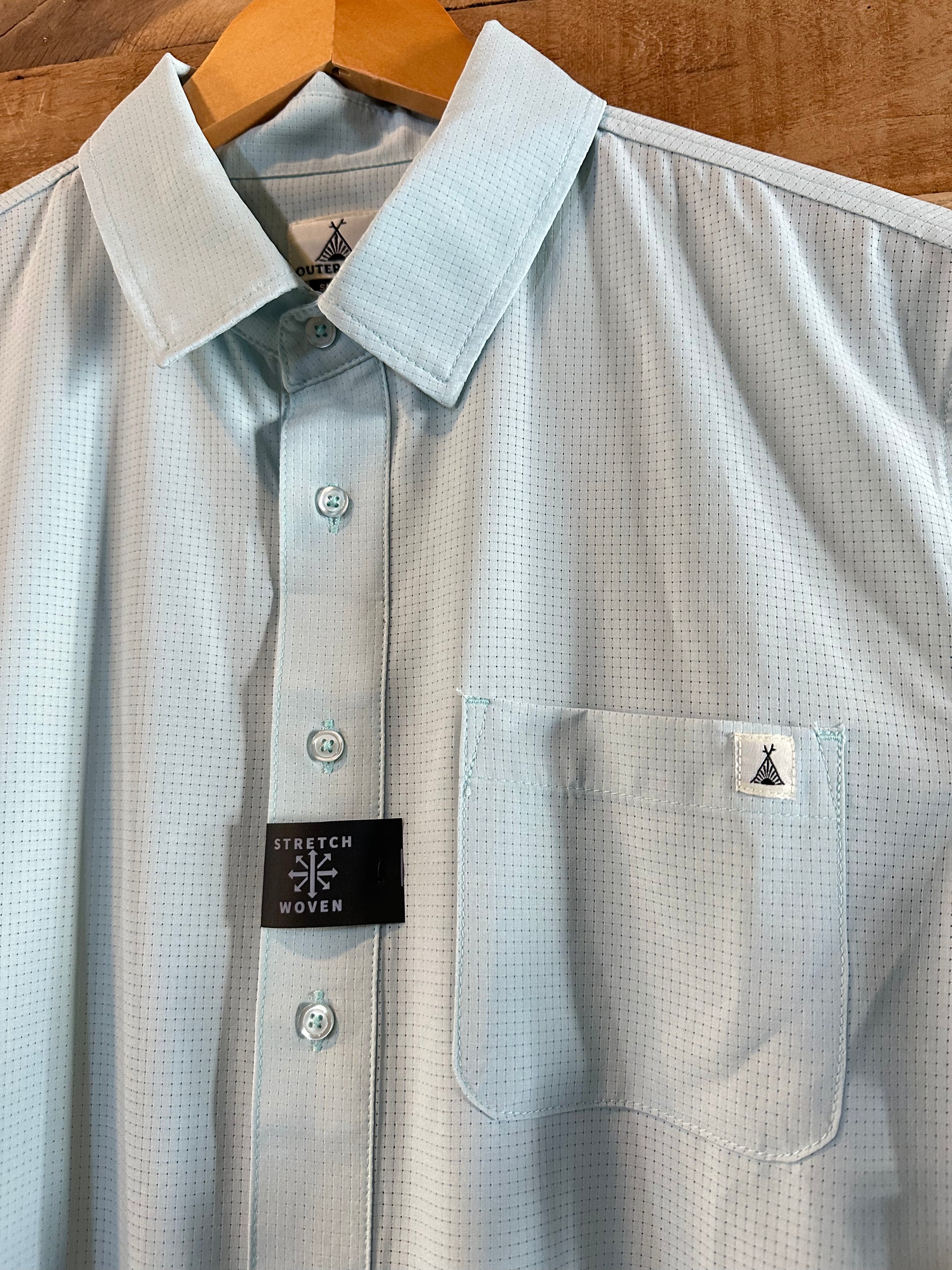 The Starliner Button Up is the perfect choice for comfort and breathability. The flowy perforated material and stretch woven fabric allow for maximum air flow while the front pocket adds a touch of functionality. This men's button down shirt is available in a nice light blue color, making it a stylish and comfortable addition to any wardrobe.