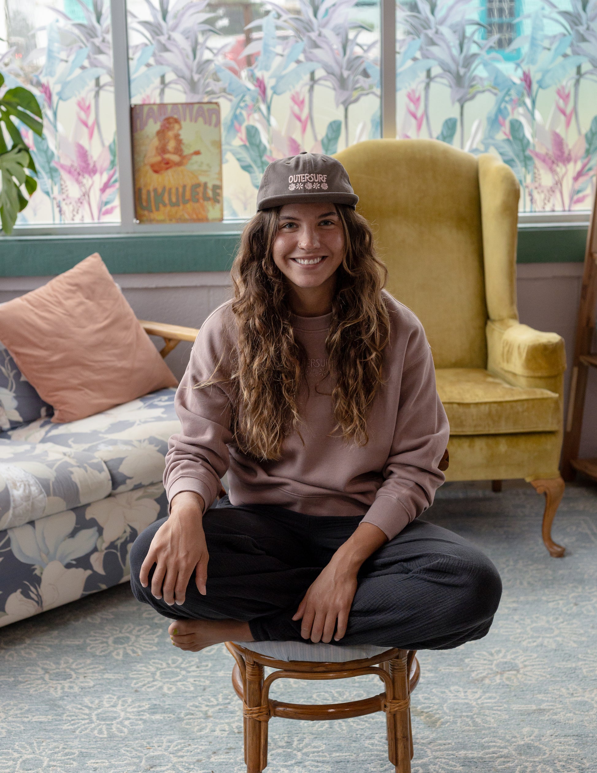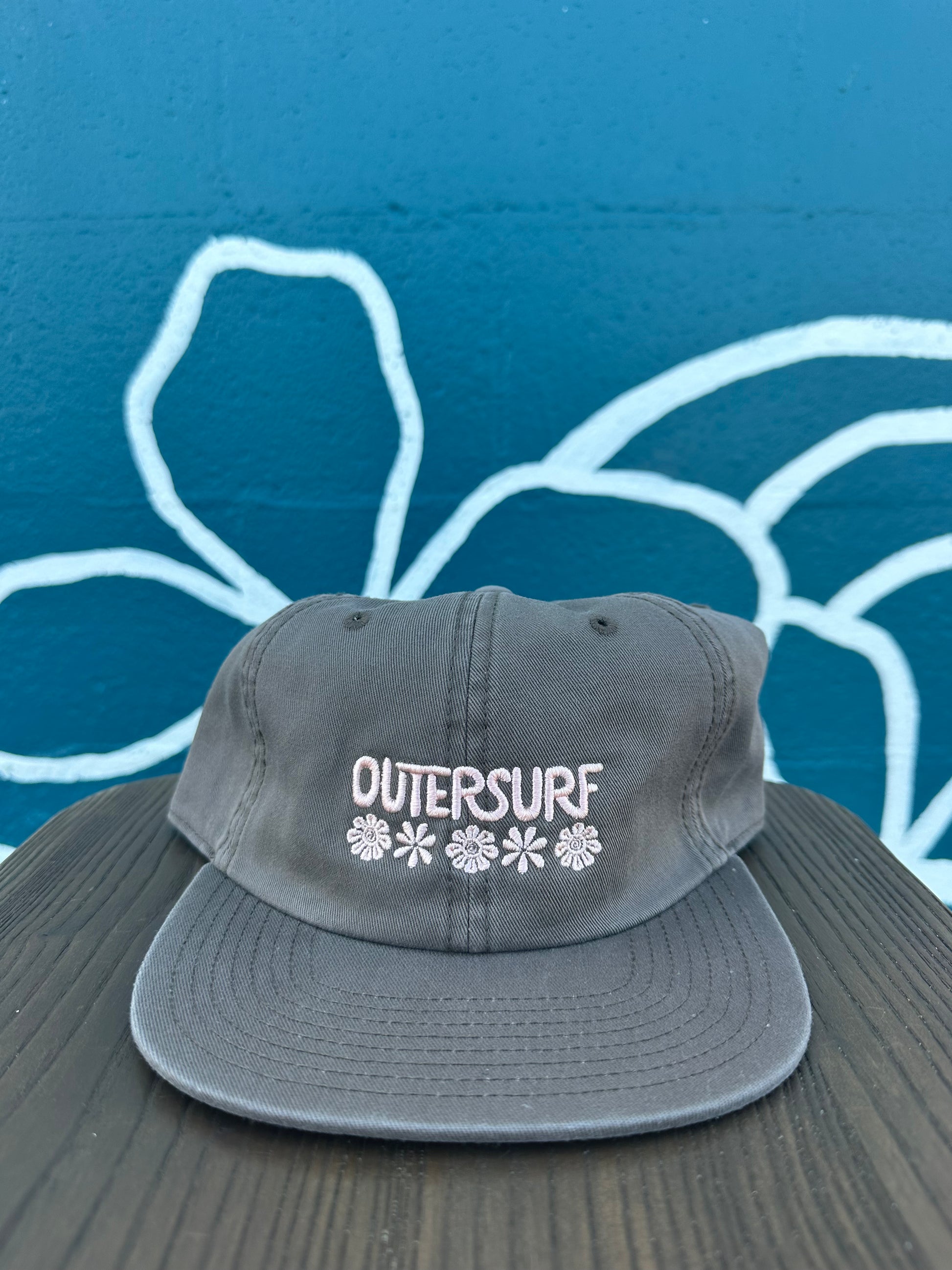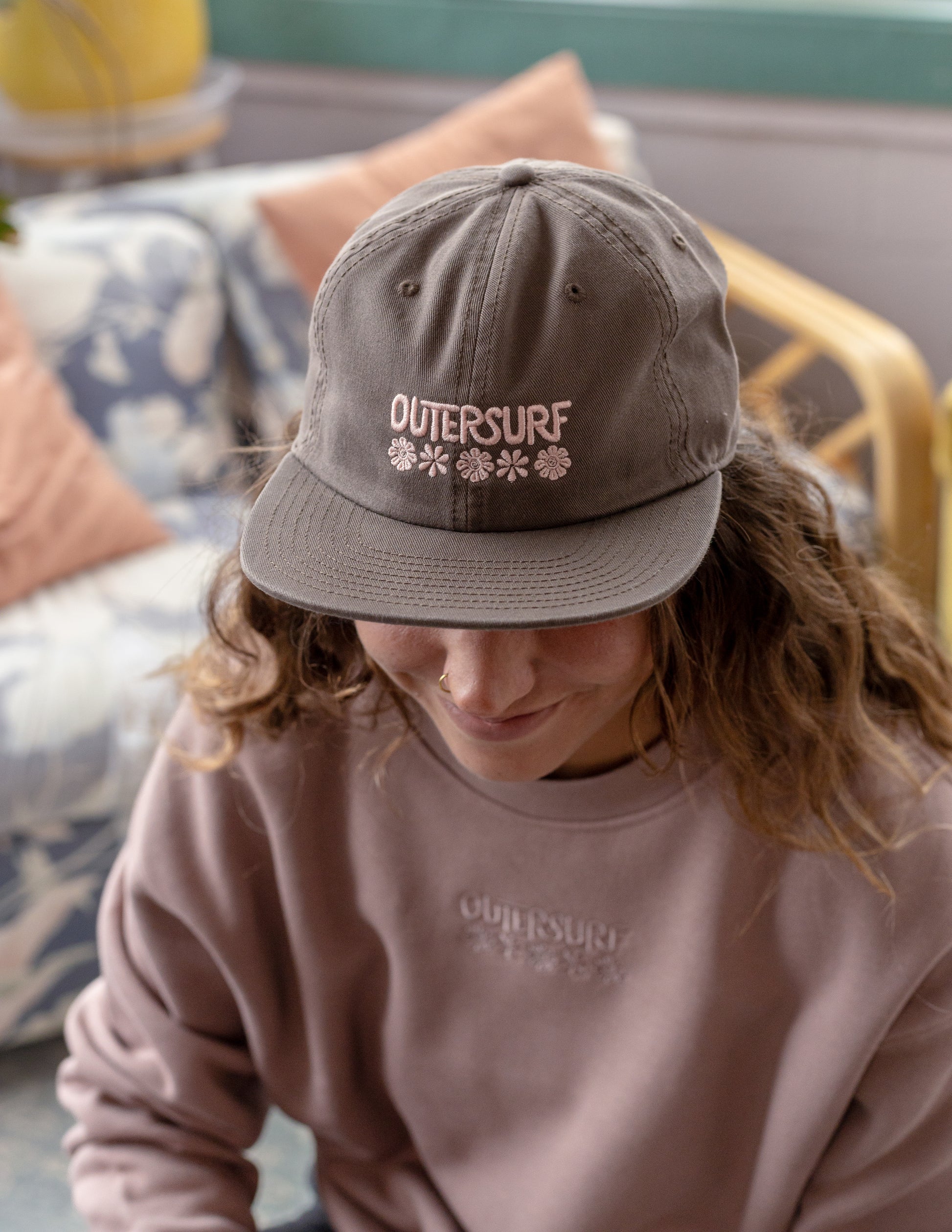 A lightweight, unstructured six-panel cap made from 100% cotton in walnut. Featuring a flat peak and adjustable fastener with a sleek metal clasp. Embroidered with the Outer Surf flower pink thread. Ideal for versatile everyday wear, ensuring a perfect fit for all.